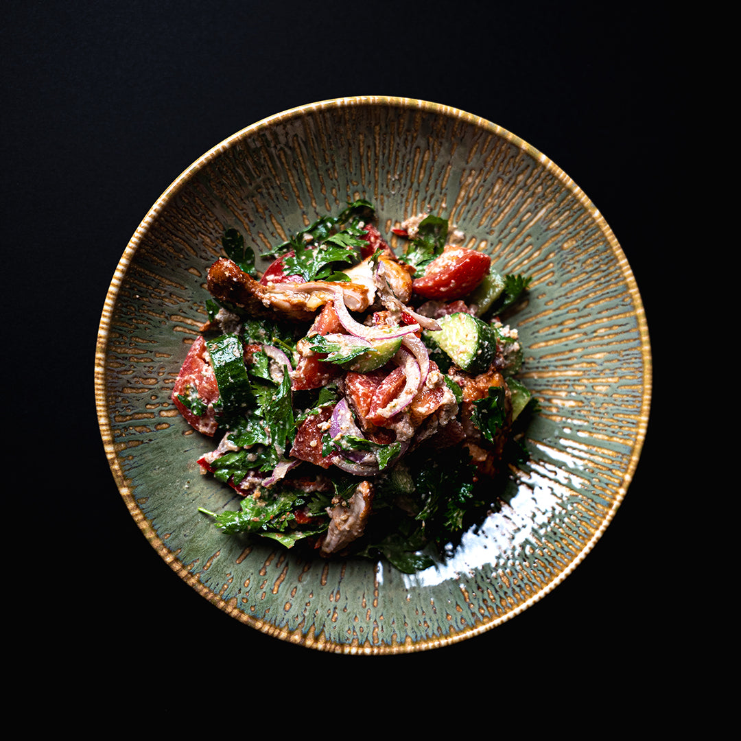Fresh tomatoes, cucumbers, onions, herbs, and wine-vinegar dressing combined with tender baked chicken thigh. A light, flavorful, and elegantly balanced salad.